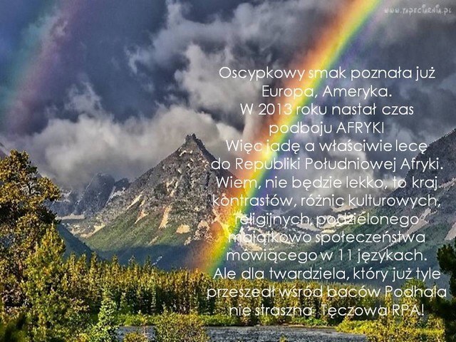 Autor: , wysłano: 28.03.2013, 08:53 Tresć ciekawa, ale trudno się ja czyta na tle bardzo barwnych zdjęć. Rozumiem, że chciałeś przyblizyć (pokazać) ten obcy, ale fascynujacy świat. W zestawieniu z rodowitym oscypkiem. Po przeczytaniu strategii biję Ci brawo. |