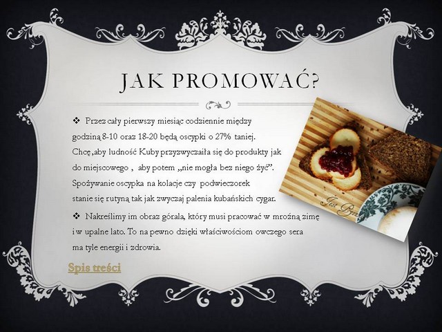 Autor: Gość, wysłano: 30.03.2013, 18:52 Gość - przeczytaj uważnie jeszcze raz prezentacje. Autor nie napisał , że gołka to oscypek lecz krowi wędzony ser , który również, chce wprowadzić na rynek. To się nazywa duszenie 2 pieczeni na jednym ogniu. Promuję oscypek, a przy okazji coś równie dobrego i przydatnego, Moim zdaniem praca bardzo fajnie zrobiona i zasługuje na 3 pkt. Bardzo fajna oprawa graficzna faktycznie kojarzy się z restauracją. |